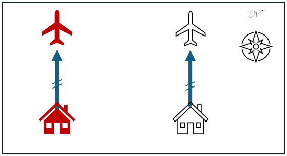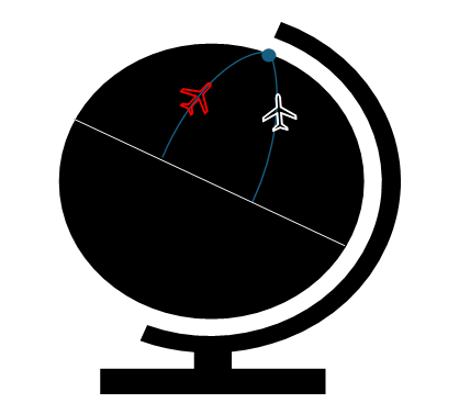 You're both flying due North, so notice how your routes on this flat map, this "flat space," are parallel to each other? So that means your routes should never intersect, right….? But now let's look at your routes on a globe.